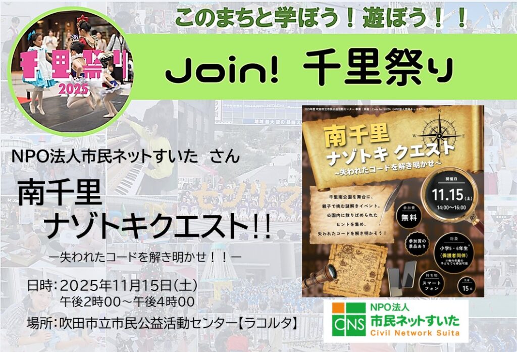 2025年11月15日 (土) 開催: 【NPO法人市民ネットすいた】さん、南千里ナゾトキクエスト!!